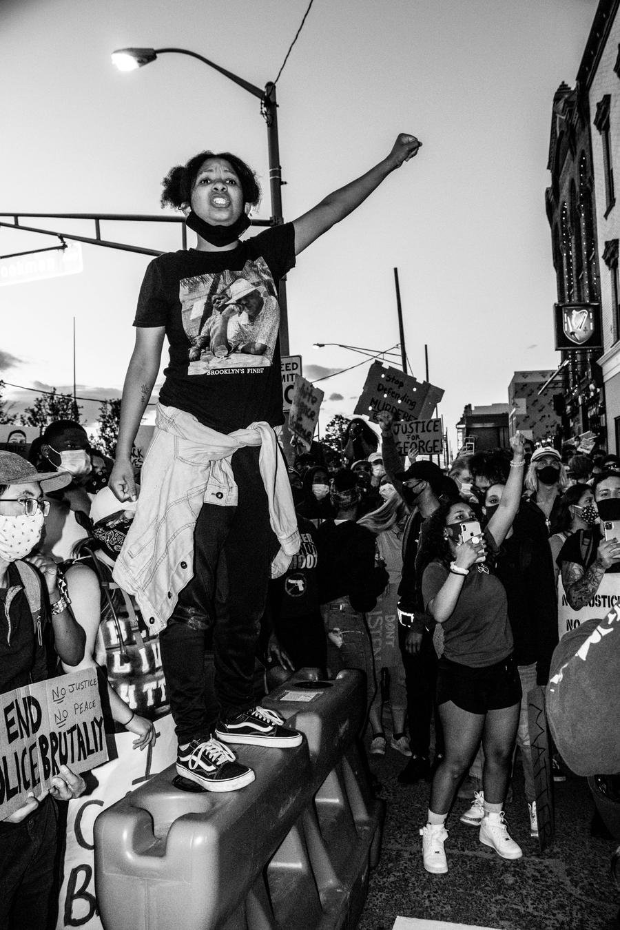 In the midst of that, this is one of the photographs that I shot. Behind me, there was a barricade that was kind of - I don't want to say broken, but that was moved by the crowd. It was getting tense. And this young lady, she was very vibrant with her words. She was letting it be known all the bullshit that's going on. Right behind me are armed police in the midst of her speaking (below).
